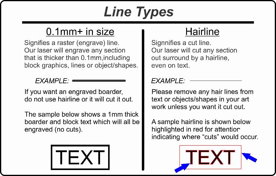 Line types are very important in laser engraving world. Simply put, a hair line will "cut", and any thing else will "engrave". Please check your artwork very carefully for stray hairlines as there is nothing worse than receiving your job back with a bunch of cut out letters that were not supposed to be cut out!  Our diagram helps to explain this concept in more detail.