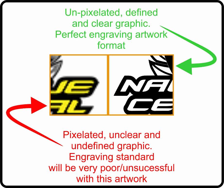 Artwork quality is also an important aspect to remember when it come to customer supplied artwork. A general rule of thumb is if it looks a little fuzzy or blurry on your computer screen, at the same size as you want engraved,  the engraving will most likely come out looking the same. This generally means the finished product will appear pixelated, unclear and sub-standard leading to disappointing results. An excellentexample of this is shown below.